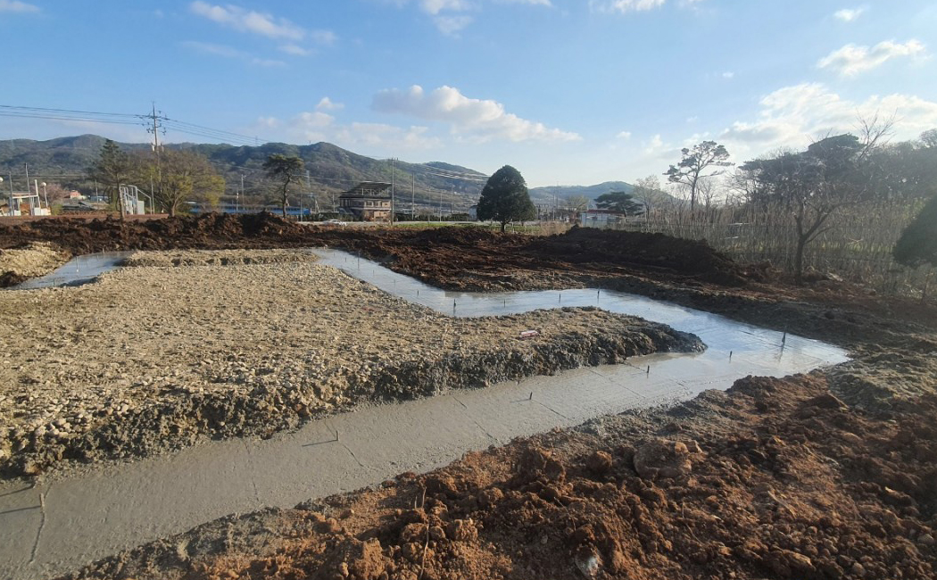 기초공사규준틀설치, 터파기, 전기/설비배관, 버림콘크리트타설, PE필름/단열재, 성토 등 기초설치 작업