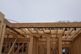 골조공사토대, 스타트후레싱 설치, 벽체, 2층 바닥, 지붕, 타이벡, 방수쉬트 공사 등 집의 뼈대를 세우는 작업